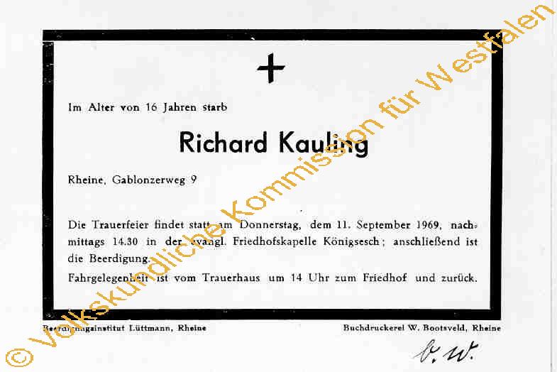 Folgender Text ist auf dünnes Papier gedruckt: "Im Alter von 16 Jahren starb Richard Kauling Rheine, Gablonzerweg 9 Die Trauerfeier findet statt am Donnerstag, dem 11. September 1969, nachmittags 14.30 in der evangl. Friedhofskapelle Königsesch; anschließend ist die Beerdigung. Fahrgelegenheit ist vom Trauerhaus um 14 Uhr zum Friedhof und zurück." Maße: 10,5 x 14,7. Herrr Mevenkamp schreibt dazu: "Statt der von Haus zu Haus gehenden Leichenbitterfrau, werden den eingeladenen Familien hier in der "Siedlung Renners" solche Anzeigen ins Haus gebracht durch Boten - ohne Rücksicht auf Konfession." s.a. 0000.52406. Am unteren Rand rechts ist handschriftlich angefügt: "b. w."