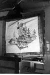 Fahnentuch: 198 x 200 cm Fahnenstange leicht konisch, Durchm.: 3,5 - 4 cm Hersteller: Bonner Fahnenfabrik (Preis: 2800 DM) Die Vorderseite der Fahne zeigt als Mittelmotiv ein Wappen (Burg- oder Stadtmauer mit Türmen, davor Petrus mit Kreuz und Schlüssel) in einem Eichenlaubkranz. Um dieses Motiv herum ist folgende Inschrift angeordnet: "Bürger-Schützen.Gesellschaft / 1965 / Warstein / Südkompanie". Auf den farblich abgesetzten Rand sind 4 Wappen gedruckt: Westfalen, Paderborn, Kreis Arnsberg, Kurköln. Auf der Rückseite der Fahne ist eine Darstellung des Erzengel Michael zu sehen. Der Schützenverein besitzt noch 3 weitere dieser übergroßen Fahnen (ca. 2 x 2 m), die allerdings nicht mehr im Gebrauch sind. Die Fahnen stammen aus den Jahren 1897 (defekt), 1957 und 1961.