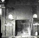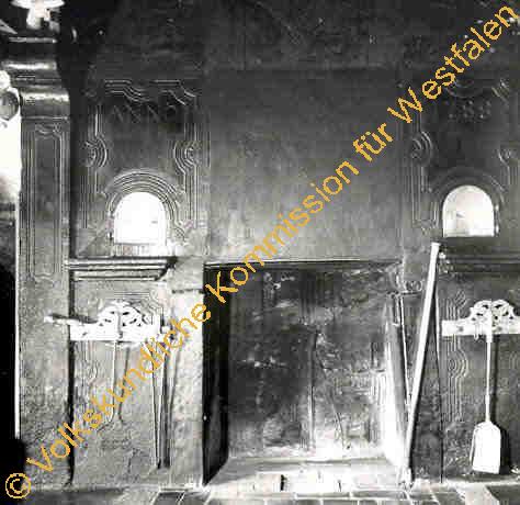 Das Bild zeigt eine Herdfeueranlage mit Herdgeräten und Herdplatte. Die ist aus dem 16. Jh (1580 in Liegen gegossen, lt. Foto v. Walterbusch nach vorl. v. Lucas Cranach), aber jetzt fast ganz kaput.