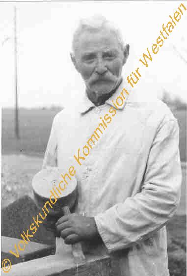 Theodor Feldmann, 86 Jahre, gelernter Maurer, später Bildhauer. Beliefert alle Gräber im Amt Roxel mit Denkmälern. Zuweilen geht er auch noch als Hausschlachter rund.