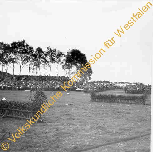 Pferde - Arena in Dülmen Vor dem Wildpferdefang fanden andere Vorführungen statt: Springreiten , Wagenfahren , Dressurreiten.
