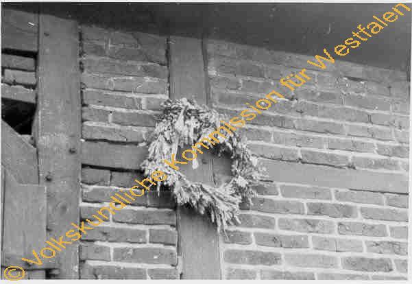 Auf mehreren Höfen im engeren Münsterland wird seit je - zumindest schon vor 1933 - nach Einbringung des letzen Fuders ein Erntekranz entweder über die Deelentür oder einfach an einer sichtbaren Stelle an der Scheunenwand befestigt. Hier : Scheunenaussenwand ( Hofseite ) des Hofes Doising in Hohenholte.