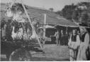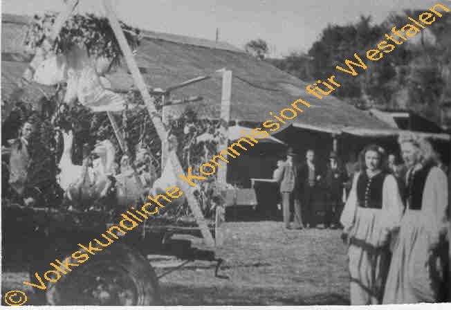 Wagen mit den Gänsen , die vor Beginn des Spieles getötet werden . Im Hintergrund ein Festzelt und Zuschauer.