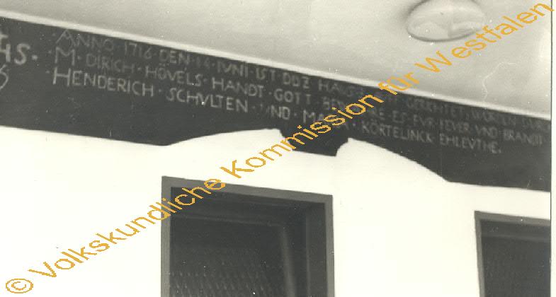 Der Balken ist nach dem Abbruch des alten Fachwerkhauses gesäubert und am Haus neu eingemauert worden. Das Haus befindet sich in einem mustergültigen Zustand. Inschrift: " Anno 1716 den 14. IVNI ist disz havsz avff gerichtet worden dvrch m. Dirich Hövels Handt Gott Bewahre es fvr ffver vnd brandt Henderich Schvlten Vund Maria Körtelinck Ehlevthe.