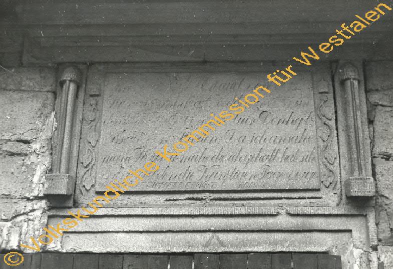 Inschriftenstein über dem Schoppentor des Uebengebäudes. Text wie auf der Inschriftentafel über dem Deelentor.