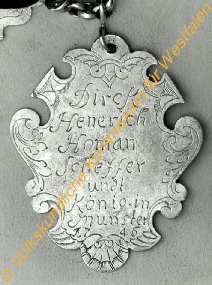 Silber; Maße 6 x 8 cm; Inschrift: Dirck Henerich Homan Scheffer und König in Mpnster.