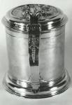 Auf dem Deckel ist St. Amandus. Der Henkel mit Griff ist ganz vergoldet. Auf dem Henkel ist eine gegossene weibliche Figur aufgelötet.
