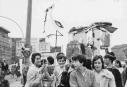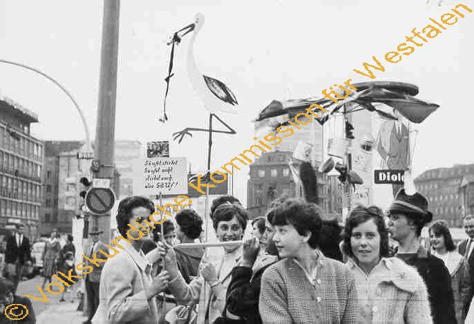 Die jungen Mädchen auf dem wege zu einem Polterabend. Die jungen Mädchen ziehen mit ihren selbstgebastelten " Emblemen " zu dem Polterabend einer Arbeitskollegin. Storch ; alter Regenschirm mit Blechdosen zum Klappern
