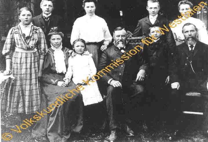 Vordere Reihe: Johanna (geb. 1896), Maria (geb. 1882), Aloysia (geb. 1903), Vater Berninghoff (Berninghoff?) (geb. 1848 und gest. 1919), Joseph (geb. 1898), Lehrer Wiegers (geb. 1854 ung gest. 1943). Hintere Reihe: Franz (geb. 1893), Anna (geb. 1896), Theodor (geb. 1889 und gest. 1915) sowie Franziska (geb. 1884). Aus dem Personenstandsregister des Amtes Rheine, Bauerschaft Catenhorn. Hermann Berninghoff aus Catenhorn heiratete Anna, Maria, Elisabeth Tebbe (Hoferbin = Piggenbrut) (geb. 03.01.1851 und gest. 05.05.1881)).