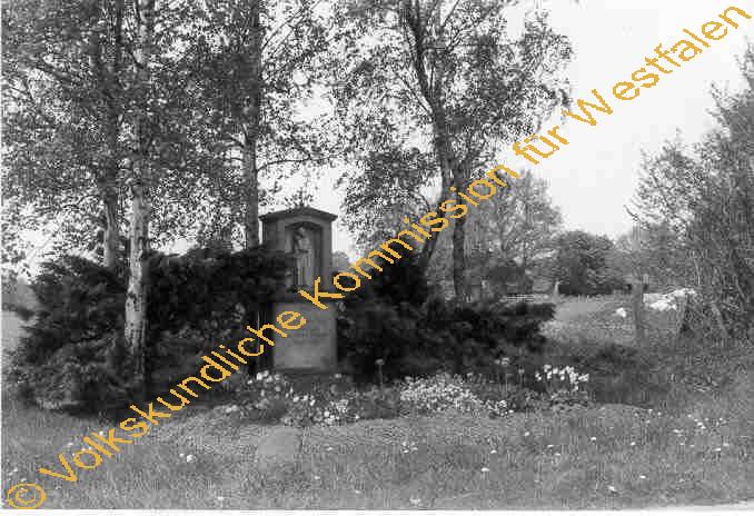 Der Bildstock steht an der Bauerschaftstraße etwa 500 bis 700 Meter von den Höfen der beiden Besitzer entfernt. Frau Evermann sagte aus, daß sie im 2. Weltkrieg Gott gelobt habe, den alten brüchigen Bildstock mit einer Pietadarstellung zu erneuern, wenn ihr Mann gesund und lebend aus dem Kriege zurückkäme. Dieser Bildstock wurde von der Firma Hanewinkel in Warendorf gekauft. In der Nische steht im Hochrelief eine etwa 60 cm hohe Madonnenfigur, die das Christuskind auf dem Arm hält. Auf dem Satteldach ist eine Steinkugel mit eisernem Kreuz befestigt. Inschrift im Sockel vorn: Maria mit dem Kinde lieb uns allen Deinen Segen gib. Inschrift im Sockel der Rückwand: Errichtet von den Eheleuten Aloys Ahlbrand Dorothea geb. Ostrop Bernhard Eversmann Maria geb. Schopmann 1954