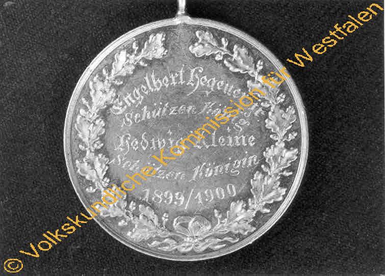 (Insgesamt sind 80 Plaketten an der Kette angebracht, vgl. D. Sauermann [u. a.]: Schützenwesen im kurkölnischen Sauerland. Arnsberg 1983. S. 89) Runde Plakette mit gebördeltem Rand und einem halbplastisch hervorgehobenem Eichenlaubkranz. Inschrift: "Engelbert Hegener / Schützenkönig / Hedwig Kleine / Schützenkönigin / 1899-1900".