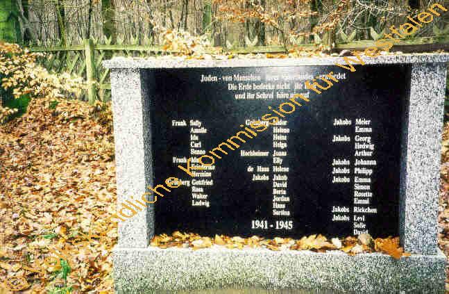 Inschrift: "Juden - von Menschen ihres Vaterlandes ermordet Die Erde bedecke nicht ihr Blut und ihr Schrei höre nie auf Frank Sally Amalie Ida Carl Benno Frank Ida Friederike Hermine Grünberg Gottfried Rosa Walter Ludwig Grünberg Isidor Helene Heinz Helga Hochheimer Jonas Elly de Haas Helene Jakobs Jakob David Berta Jordan Hans Sartina Jakobs Meier Emma Jakobs Emma Jakobs Georg Hedwig Arthur Jakobs Johanna Jakobs Philipp Jakobs Emma Simon Rosette Emmi Jakobs Rickchen Jakobs Levi Sofie David"