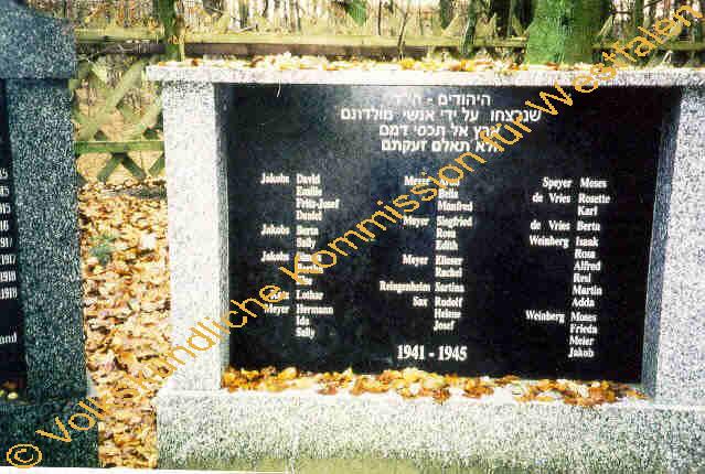 Inschrift: " Jakobs David Emilie Fritz-Josef Daniel Jakobs Berta Sally Jakobs Simon Bertha Else Katz Lothar Meyer Hermann Ida Sally Meyer Aron Bella Manfred Meyer Siegfried Rosa Edith Meyer Elieser Rachel Reingenheim Sartina Sax Rudolf Helene Josef Speyer Moses de Vries Rosette Karl de Vries Berta Weinberg Isaak Rosa Alfred Resi Martin Adda Weinberg Moses Frieda Meier Jakob"