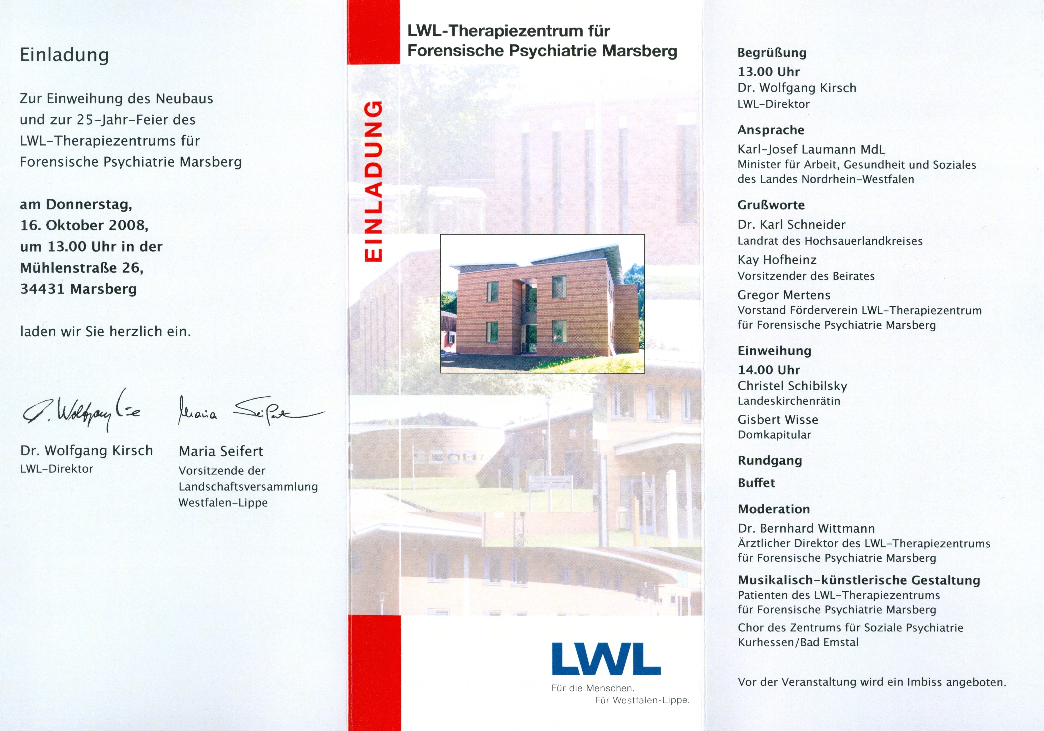 Beides ¿ Jubiläum und Gebäudeeinweihung ¿ nehmen LWL-Direktor Dr. Wolfgang Kirsch und, stellvertretend für den verhinderten Minister Karl-Josef Laumann, Uwe Dönisch-Seidel, Maßregelvollzugsbeauftragter im nordrhein-westfälischen Gesundheitsministerium, zum Anlass, wieder ins Hochsauerland zu kommen. Gemeinsam mit dem Landrat Dr. Karl Schneider sowie dem Beiratsvorsitzenden Kay Hofheinz und dem Fördervereins-Vorstand Gregor Mertens werden sie Rückschau halten und Perspektiven aufzeigen.