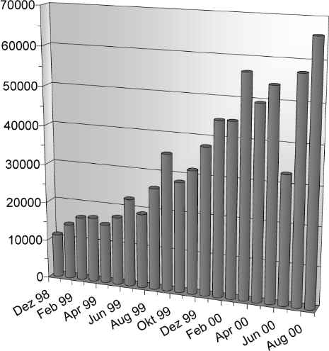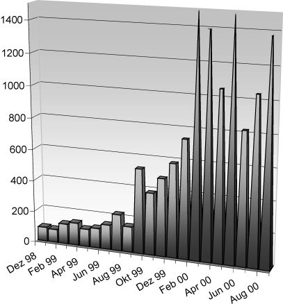 10 Der Einbruch im Juni 2000 ist darauf zurückzuführen, daß das System aufgrund eines Fehlers vom 20. Juni bis Anfang Juli annähernd 2 Wochen lang nicht genutzt werden konnte.