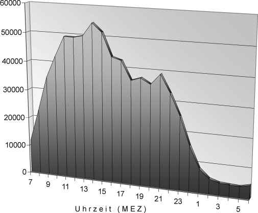 Da es sich dabei um die typischen Computerarbeitszeiten von Internetanwendern handelt, dürften die meisten Anfragen aus dem deutschen und europäischen Raum stammen. Schüler, Studenten und Beruftstätige, die zu Hause keinen Internetanschluß haben, sind auf die Öffnungszeiten von Universitäten, Bibliotheken und sonstigen Arbeitsstätten angewiesen. Wenigstens bei den Anfragen ab dem späten Nachmittag dürfte es sich aber zum großen Teil um Benutzer handeln, die privat über PC und Internetanschluß verfügen und zu Hause surfen.