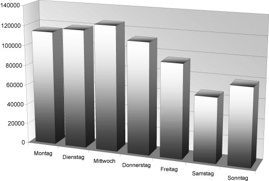 Weitere Informationen über das Benutzerverhalten liefert die Verteilung der Zugriffe auf Wochentage (Abb. 4). Während die meisten Zugriffe an Arbeitstagen erfolgen, lassen die immer noch beträchtlichen Zahlen für das Wochenende auf einen erheblichen Anteil an Nutzern schließen, die privat über einen Internetzugang verfügen und ihre Freizeit auch für Recherchen im Internetverbund der NRW Archive nutzen.