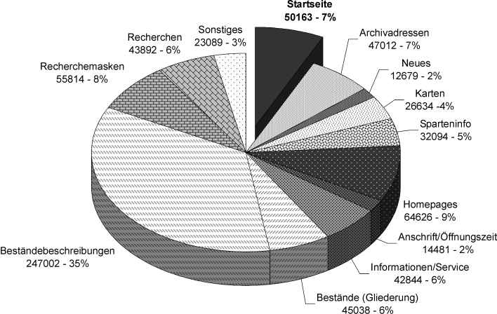 Mehr als die Hälfte der Zugriffe entfallen auf die Beständeübersichten und die Rechercheseiten. Die Zugriffsstatistiken geben bis zu einem gewissen Grad Aufschluß darüber, welchen Weg die Besucher bei Ihren Recherchen nach Beständen einschlagen.