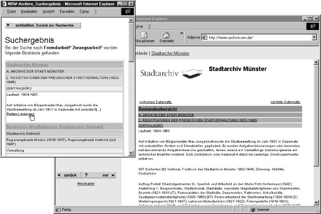 An einem aktuellen Beispiel sei das Problem der unvollständigen Beständebeschreibung erläutert: Bei der Suche nach dem Begriff Fremdarbeiter werden in dem nordrhein-westfälischen Verbundsystem derzeit vier Bestände aus drei Archiven ausgewiesen. Es ist ausgeschlossen, daß in anderen nordrhein-westfälischen Archiven keine Informationen über Fremdarbeiter im Dritten Reich verfügbar wären. Tatsächlich wirft das Internetsystem aber nur diese drei oder vier Archive aus, weil die Beschreibungen der anderen Archive mit einschlägigen Beständen nicht so tief gehen, daß der Benutzer fündig werden könnte. (Fussnote 12) Insofern droht Archiven mit geringer Informationstiefe ihrer Beständeübersichten auch in einem Verbundsystem eine gewisse Marginalisierung.