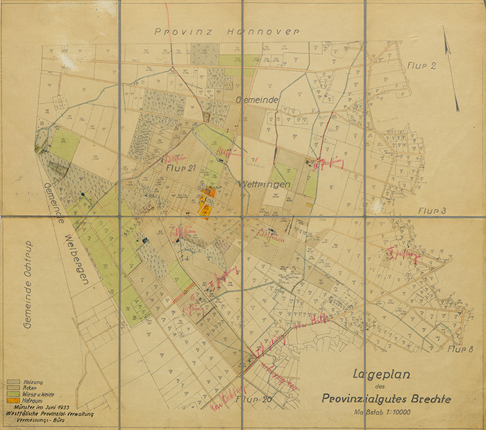 Wettringen: Lageplan des Provinzialgutes Brechte [mit Einzeichnung der Nutzungsarten] | 1933-06
