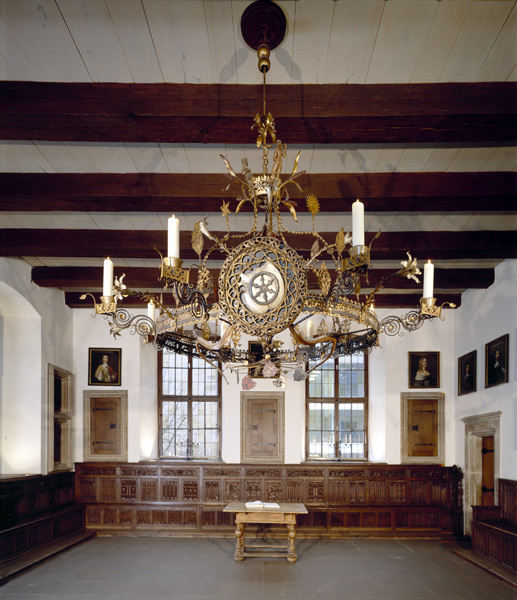 Osnabrück: Friedenssaal im Rathaus, Teilansicht mit Fensterfront und kunstvoll geschmiedetem Kronleuchter | 1997-12 Mahlstedt, Olaf | Münster, LWL-Medienzentrum für Westfalen / O. Mahlstedt | 10_3031 URL: http://www.westfaelische-geschichte.de/med1350 Internet-Portal "Westfälische Geschichte"