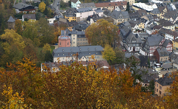 Nassau a. d. L.: Schloss Stein und das Nassauer Rathaus (Adelsheimer Hof), von Burg Nassau aus gesehen, 2007 | 2007-10-27 Weidner, Marcus | Marcus Weidner | MW280927 URL: http://www.westfaelische-geschichte.de/med1652 Internet-Portal "Westfälische Geschichte"
