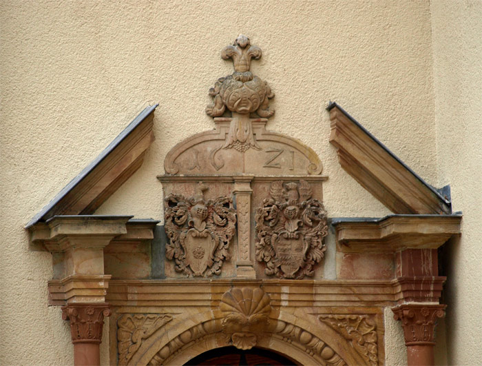 Nassau a. d. L.: Supraporte mit Allianzwappen am Mittelbau des Steinschen Stadtschlosses, datiert 1621, 2007 | 2007-10-27 Weidner, Marcus | Marcus Weidner | MW271090 URL: http://www.westfaelische-geschichte.de/med1668 Internet-Portal "Westfälische Geschichte"
