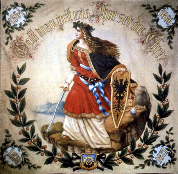 Fahne mit dem Bild der Germania: "Gott war mit uns. Ihm sei die Ehr!" | 1871 [nach] Objekt: Köln, Kölnisches Stadtmuseum Münster, Landesmedienzentrum für Westfalen/E. Tschich URL: http://www.westfaelische-geschichte.de/med17 Internet-Portal "Westfälische Geschichte"