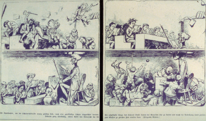 Die Schulfrage im 19. Jahrhundert: Karikatur auf den Schulunterricht, aus: "Fliegende Blätter", 1892
