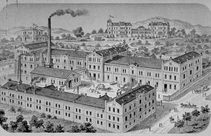 Nadelfabrik St. Witte, Iserlohn, Stefanstraße, Villa Bellevue, Stennerstraße und Villa Carl Witte, Gartenstraße, Ansicht (Vogelschau) von Südwesten, um 1875 | 1875 [um] Iserlohn, Stadtarchiv URL: http://www.westfaelische-geschichte.de/med263 Internet-Portal "Westfälische Geschichte"