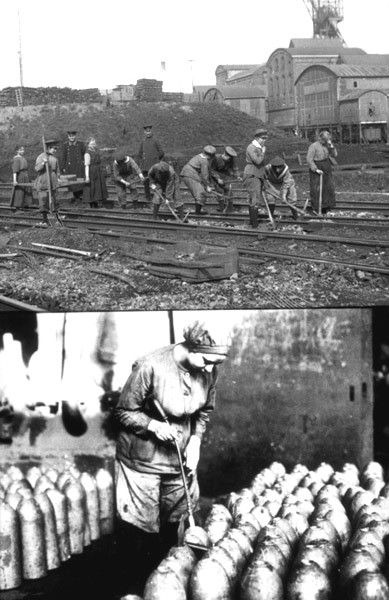 Arbeiterinnen bei Gleisarbeiten am Hauptbahnhof Recklinghausen, 1918 (o) / Arbeiterinnen bei der Geschoßrevision, um 1917 | 1918 / 1917 [um] Münster, LWL-Medienzentrum für Westfalen, Sammlung Schäfer (o) / Essen, Historisches Archiv Krupp (u)