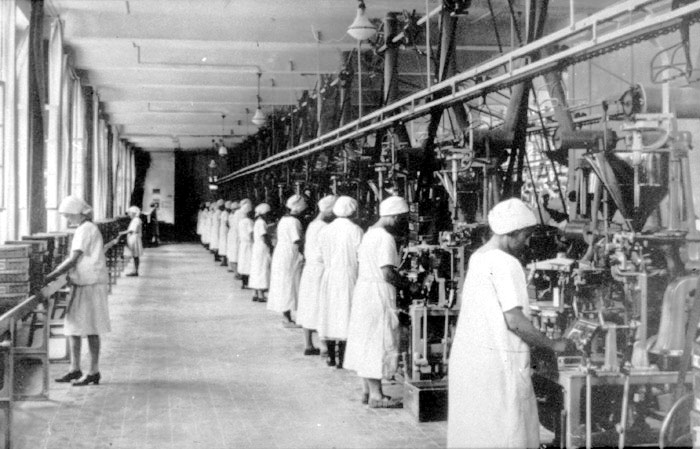 Arbeiterinnen im Maschinensaal (Abfüllanlage) der Firma Dr. Oetker, Bielefeld, Lutterstraße, 1930 | 1930 Bielefeld, Stadtarchiv und Landesgeschichtliche Bibliothek URL: http://www.westfaelische-geschichte.de/med271 Internet-Portal "Westfälische Geschichte"