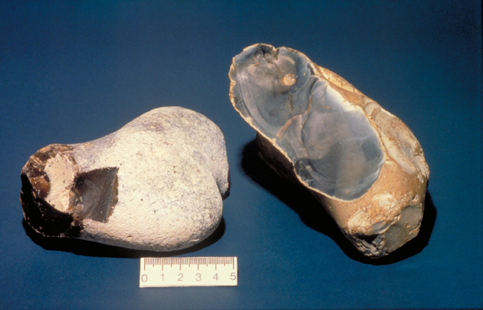 Werkzeugherstellung in der Steinzeit: zwei Feuersteinknollen