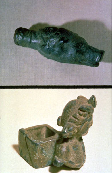 Schlüsselgriff, Soest-Ardey (o) / Bronzene Dreifußtisch-Applik von Kamen-Westick (u)
