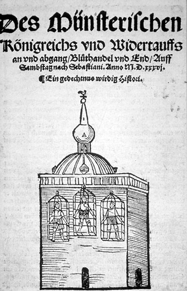 I. Das Thema und seine Bedeutung: Bericht der Hinrichtung der Wiedertäuferführer und Abbildung des Turms der St. Lambertikirche mit den drei Käfigen, "Des Münsterischen / Königreichs und Widertauffs / an und abgang, / Bluthandel und End", Münster 1536 | 1536 Objekt: Münster, Westfälisches Landesmuseum für Kunst und Kulturgeschichte Münster | Bibl.Sign. SNC 3 Münster, Westfälisches Landesmuseum für Kunst und Kulturgeschichte Münster URL: http://www.westfaelische-geschichte.de/med621 Internet-Portal "Westfälische Geschichte"