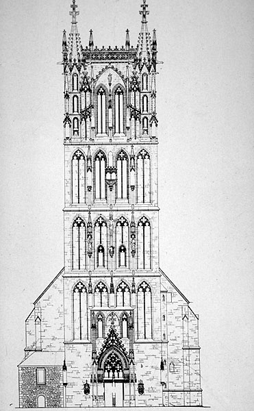 IV. Die Herrschaft der Täufer, Bildersturm: Turm der Überwasserkirche in Münster (Aufrißzeichnung) Objekt: Münster, Westfälisches Landesmuseum für Kunst und Kulturgeschichte Münster | Max Geisberg, Bau- und Kunstdenkmäler von Westfalen, Stadt Münster, 1941, Bd. 6, Tafel XLVI Münster, Westfälisches Landesmuseum für Kunst und Kulturgeschichte Münster URL: http://www.westfaelische-geschichte.de/med626 Internet-Portal "Westfälische Geschichte"
