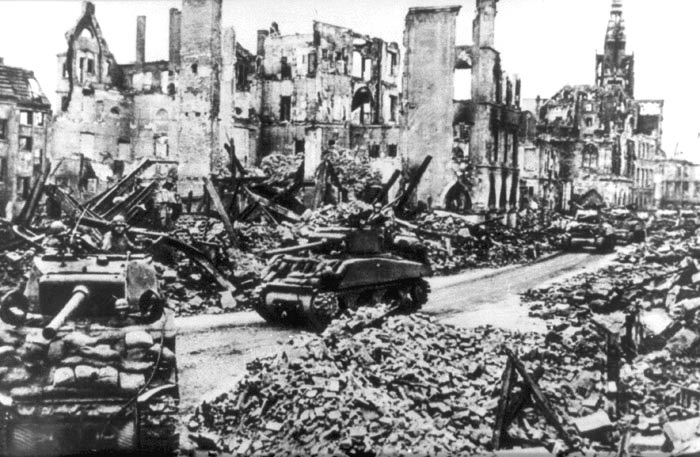Alliierte Panzerkolonne auf dem Prinzipalmarkt in Münster, April 1945 | 1945-04 Objekt: Münster, Stadtarchiv Münster, LWL-Medienzentrum für Westfalen/O. Mahlstedt URL: http://www.westfaelische-geschichte.de/med65 Internet-Portal "Westfälische Geschichte"