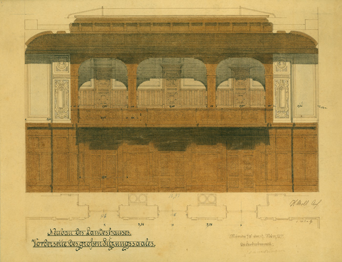 Münster, Mauritztor/Fürstenbergstraße: Neubau des Landeshauses, Vorderseite des grossen Sitzungssaales | 1899-03-17