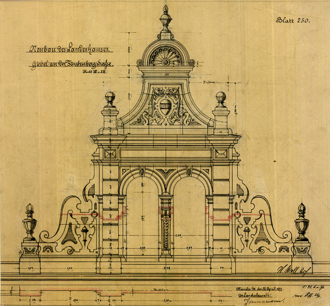 Münster: Neubau des Landeshauses, Blatt 250: Giebel an der Fürstenbergstraße (Flucht XIII u[nd] XIV) [Aufriss und Schnitt] | 1899-04-26