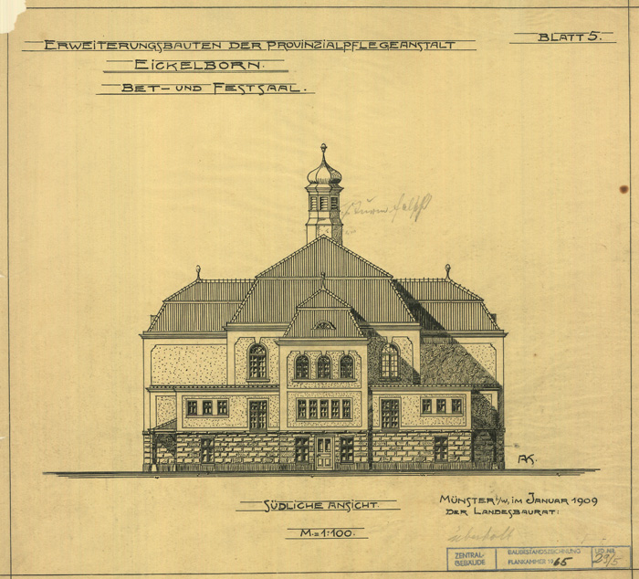 Lippstadt-Eickelborn: Erweiterungsbauten der Provinzialpflegeanstalt Eickelborn, Bet- und Festsaal, Blatt 5: südliche Ansicht [Vermerk: überholt] | 1909-01