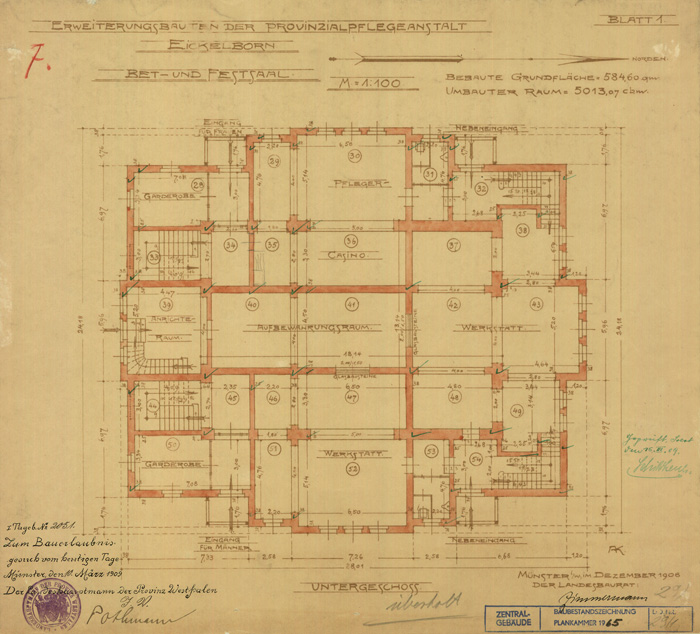 Lippstadt-Eickelborn: Erweiterungsbauten der Provinzialpflegeanstalt Eickelborn, Bet- und Festsaal, Blatt 1: Untergeschoss [Vermerk: überholt, Beilage zum Bauerlaubnisgesuch] | 1908-12