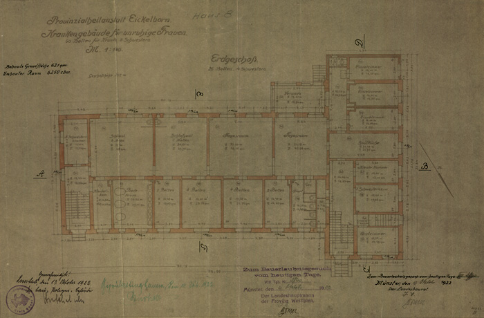 Lippstadt-Eickelborn: Provinzialheilanstalt Eickelborn, Krankengebäude für unruhige Frauen [Haus 8], Erdgeschoß [Beilage zum Bauerlaubnisgesuch, Genehmigungsvermerk der Baupolizeibehörde] | 1922-10-04
