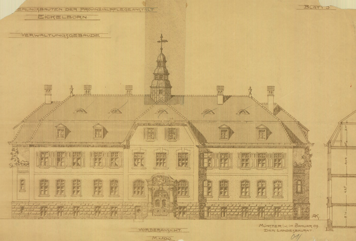 Lippstadt-Eickelborn: [...]erungsbauten der Provinzialpflegeanstalt Eickelborn, Blatt 5 [?]: Verwaltungsgebäude, Vorderansicht | 1909-01