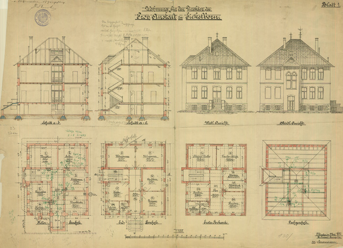 Lippstadt-Eickelborn: Prov[inzial] Anstalt zu Eickelborn, Wohnung für den Direktor, Blatt 1 [verschiedene Schnitte, Ansichten] | 1890-05
