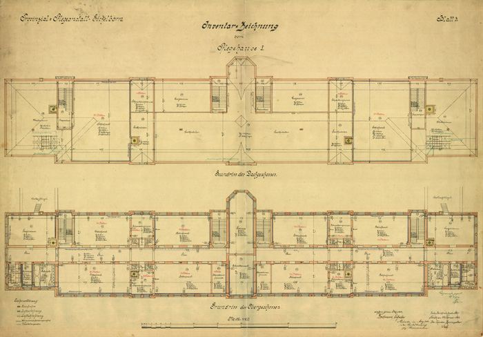 Lippstadt-Eickelborn: Provinzial-Pflegeanstalt-Eickelborn, Inventar-Zeichnung vom Pflegehaus I, Blatt 3: Grundriss des Dachgeschosses, Grundriss des Obergeschosses | 1903-03