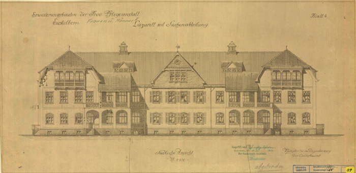 Lippstadt-Eickelborn: Erweiterungsbauten der Prov[inzial] Pflegeanstalt Eickelborn, Blatt 4: Lazarett mit Siechenabteilung, Südliche Ansicht [Frauen und Männer, 7] | 1909-12