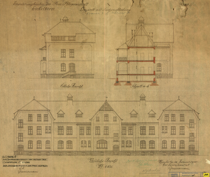 Lippstadt-Eickelborn: Erweiterungsbauten der Prov[inzial] Pflegeanstalt Eickelborn, Blatt 5, Lazarett mit Siechenabteilung, Nördliche Ansicht [Beilage zum Bauerlaubnisgesuch] | 1910-01