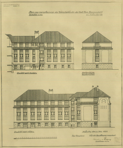 Münster: Plan zur Vergrößerung des Dienstgebäudes der Westf[älischen] Prov[inzial] Feuersozietät zu Münster i. W.: Ansicht nach Norden; Westansicht des Gartenflügels; Ansicht nach Süden | 1922-01-16 Objekt: LWL-Bau- und Liegenschaftsbetrieb Münster, Internet-Portal "Westfälische Geschichte" | 66_10_04 URL: http://www.westfaelische-geschichte.de/kar842 Internet-Portal "Westfälische Geschichte"