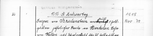 | 1515-11-30 | Archiv: Laasphe, Fürstliches Archiv Benutzungsort: Fürstliches Archiv zu Sayn-Wittgenstein-Hohenstein Bestand: Urkunden | Regest | |