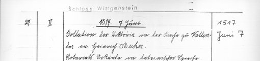 | 1517-06-07 | Archiv: Laasphe, Fürstliches Archiv Benutzungsort: Fürstliches Archiv zu Sayn-Wittgenstein-Hohenstein Bestand: Urkunden | Regest | |